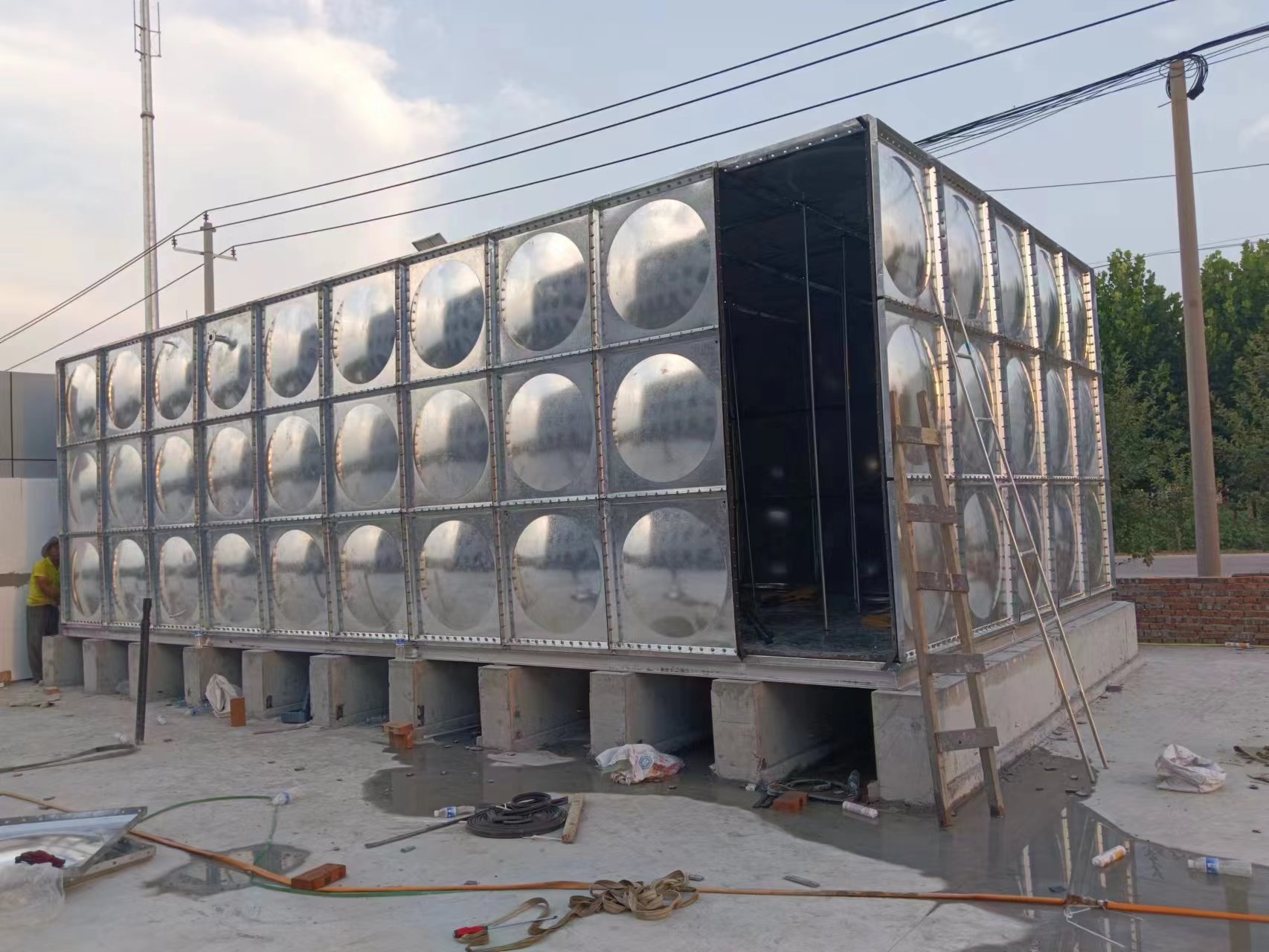 我廠承接的山東德州禹城市山東御景建筑一臺150立方鍍鋅板水箱經(jīng)過六天的時間已經(jīng)安裝試水完成。安裝現(xiàn)場圖如下: