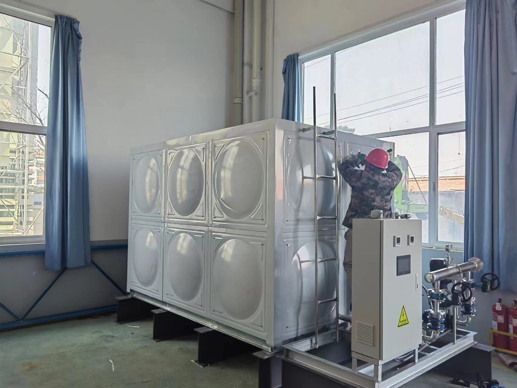 我公司承接的山東省濰坊星宇集團一臺聚氨酯304不銹鋼保溫水箱已經(jīng)安裝完成,水箱用做生活水箱,客戶對我公司產(chǎn)品質(zhì)量和安裝師傅的手藝表示滿意和認可。現(xiàn)場實拍照片如下: