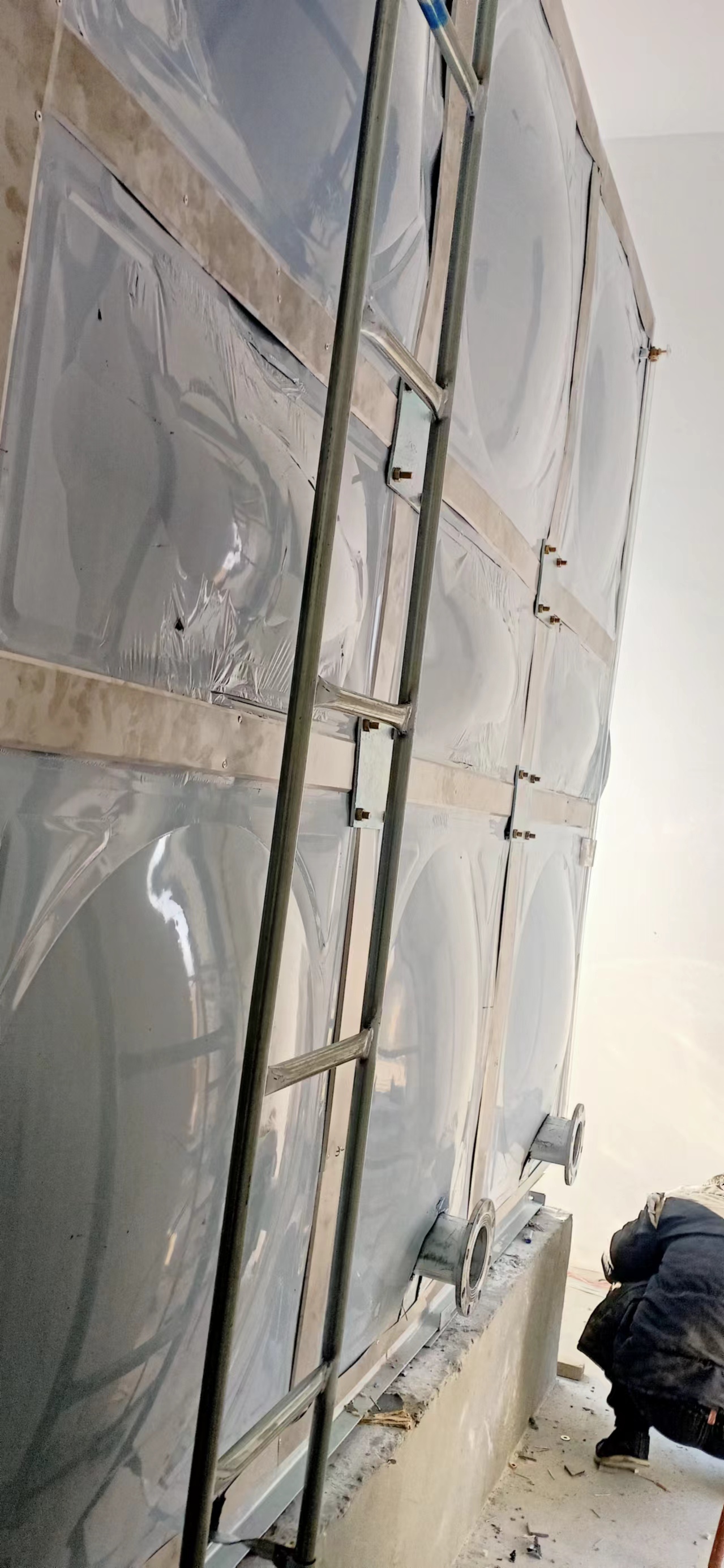 我廠承接的這臺49立方玻璃鋼保溫水箱安裝于山東省濱州市陽信縣中悅悅心城,此次水箱內部采用SMC玻璃鋼水箱,外部采用聚氨酯加201材質外殼保溫,起到良好的保溫效果。現場圖如下: